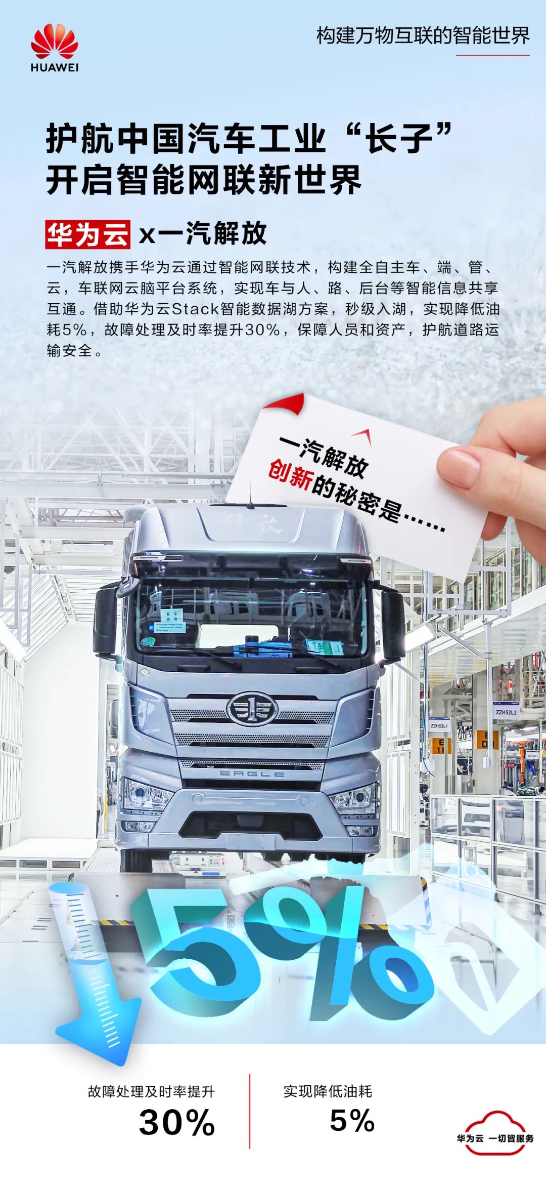 一汽解放作为中国汽车工业的“长子”,近年来开启了数字化、智能化的转型升级与华为云携手通过智能网联技术构建全自主车、端、管、云车联网云脑平台系统,实现车与人、路、后台等智能信息共享互通借助华为云Stack提供的智能数据湖方案,秒级入湖,实现降低油耗5%,故障处理及时率提升30%,柴油折扣金额约2900多万元,月度减少二氧化碳排放7.2万吨,并通过智能设备加安全的服务。降低25%以上的车队事故率,保障人员和资产,护航道路运输安全。