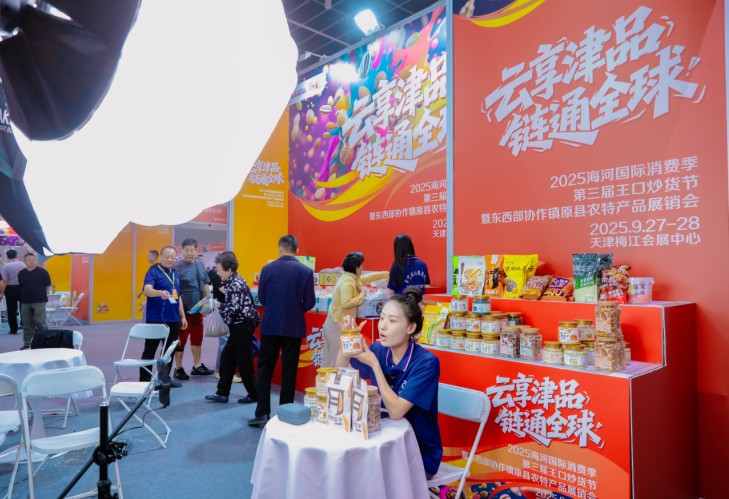 9月27日上午,2025海河国际消费季“云享津品 链通全球”第三届王口炒货节暨静海区东西部协作镇原县农特产品展销会在梅江会展中心S2馆“喷香”开幕,各类“明星产品”备受追捧。