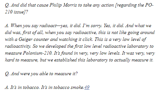 Philip Morris(生产万宝路牌卷烟的公司,曾是全球第一大烟草集团)公司的一位退休副主席证实,其公司和烟草行业早就知道了钋元素的存在,并建立了测量实验室。