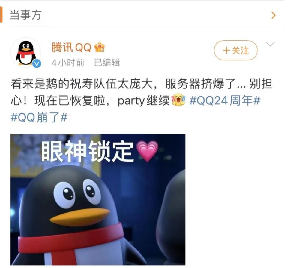2月10日上午,QQ疑似出现连接问题,众多网友反馈无法正常使用。一时间“QQ崩了”冲上热搜榜首,而今天也是腾讯QQ24周年生日。中午,崩溃问题已修复。官方对此回应称:看来是鹅的祝寿队伍太庞大,服务器挤爆了。