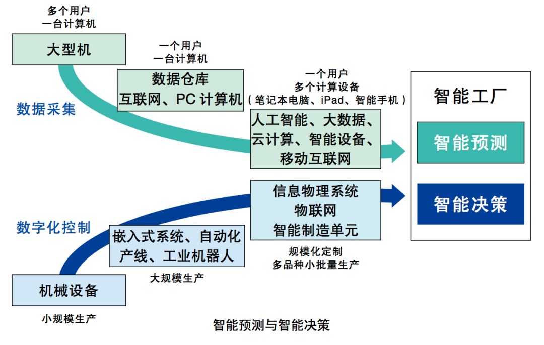 物联网:以数控加工过程为例,“机床/工件/刀具”系统的振动、温度变化对产品质量有重要影响,需要自适应调整工艺参数,在这方面,物联网传感器对制造工况的主动感知和自动控制能力明显高于工人。因此,应用物联网传感器,实现“感知—分析—决策—执行”的闭环控制,能够显著提高生产制造的质量和效率。同样,一个企业的制造过程中,存在很多动态的、变化的环境,制造系统中的某些要素(设备、检测机构、物料输送和存储系统等)必须能动态地、自动地响应系统变化,这也依赖于制造系统的智能化。