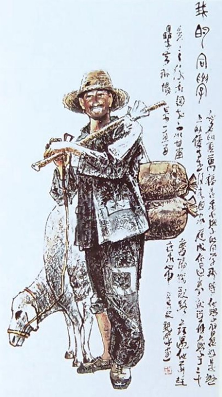 《我的同学》流淌着我真挚的情感,在创作时,我不拘泥人物形象套路化的表现,而着重刻画人物的精神内涵。以使读者看了之后充分展开心中无穷的想象。这幅画为六尺大,在画面构图时,我着重突出人物,并对人物的衣着和表情进行了细致刻画,不画复杂的环境和背景,用一段小散文作为衬景,又对面面做一补充说明。不知读者是否能看出我突出主体、追求简洁、强化张力的追求。我想以一质草幅, 显示画面人物冒酷暑赶集的艰辛:以一张饱经沧桑的面孔。揭示出人物的坎坷历程:一双锐利明亮的眸子折射出人物的睿智:一双破旧的解放鞋表现出人物生活的清贫:一条挽起来的裤腿暗示人物为生计而奔波的匆忙,至于那肩扛的麻袋,手牵的肥羊,又显示着他努力后的收获。我想,不同职业、不同文化层次、不同社会经历的人。会通过画面里的张万福,找到各自心中的张万福!