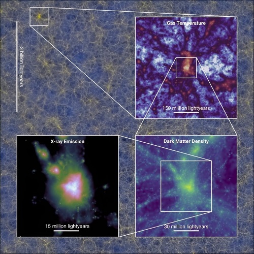 荷兰莱顿大学科学家主导的国际团队进行了迄今已知最大规模的宇宙学计算机模拟,不仅跟踪暗物质,还跟踪普通物质(如行星、恒星和星系等),从而管窥宇宙是如何进化的。相关3篇论文发表于最新一期英国《皇家天文学会月刊》。