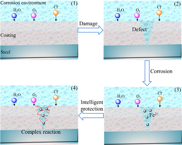 金属表面完美的涂层可以有效抵抗腐蚀介质(如O2、Cl-和H2O)的侵蚀,能对金属基体形成有效保护。当涂层受到破坏时,在涂层表面产生的缺陷将利于腐蚀介质渗透到涂层中,继而加速金属腐蚀。