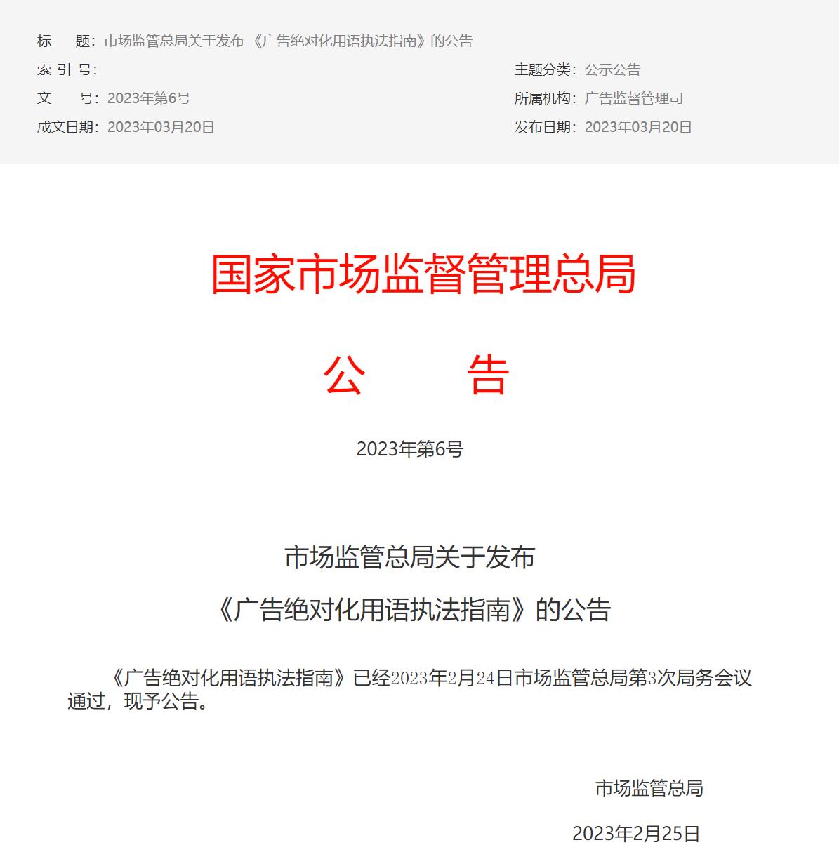 3月20日,国家市场监督管理总局发布《广告绝对化用语执法指南》(以下简称《指南》),为市场监管部门开展广告绝对化用语监管执法提供指引。