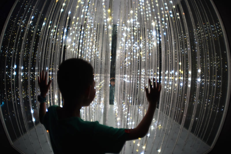 5月27日,一名孩子在数博会“追梦·未来”数字艺术特展上体验艺术作品《梦立方》。