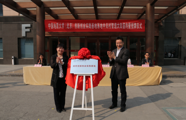 >> 中关村智造大街总经理程静与中国地质大学(北京)党委副书记姜恩来共同为创新创业实践基地揭牌。