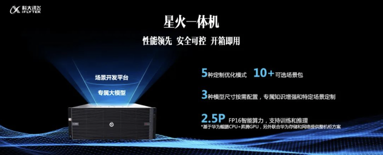 星火一体机基于华为鲲鹏CPU+昇腾GPU,另外联合华为存储和网络提供整机柜方案。图片来源:科大讯飞